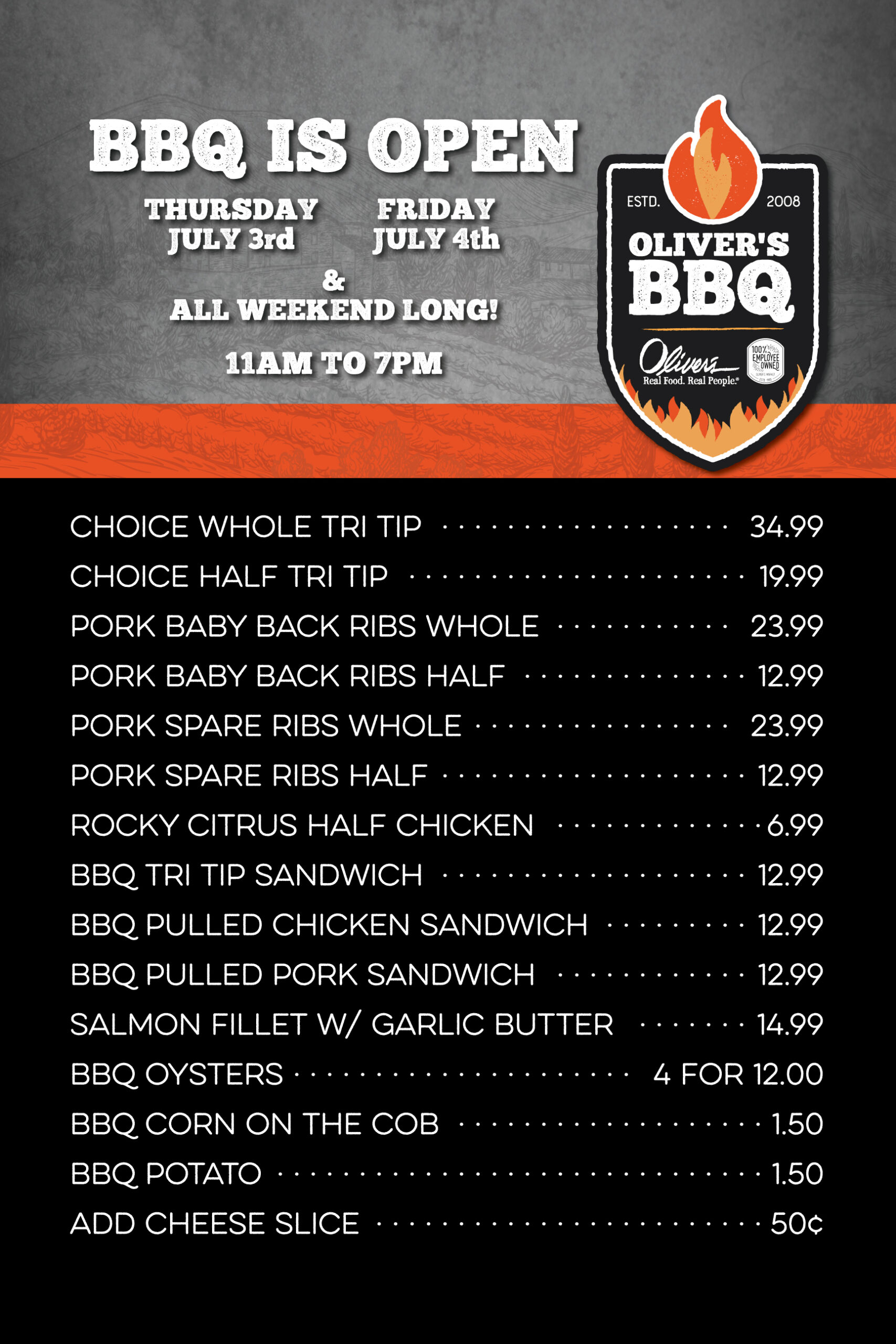 Oliver’s BBQ is open for 3rd and 4th of July!