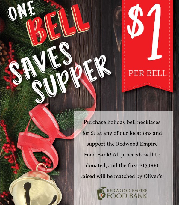 “We value the huge role that Redwood Empire Food Bank plays in supporting our community, and our customers do, too,” said Scott Gross, Oliver’s Market General Manager. “We are very proud of the growth in our campaign in recent years, and are pleased to be offering a company match on the first 15,000 bells sold. It’s a wonderful way to ring in some much needed support for Redwood Empire Food Bank and our neighbors in need during the holiday season.”