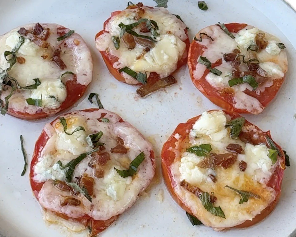 Baked Tomatoes with Toma, Bay Blue, and Bacon