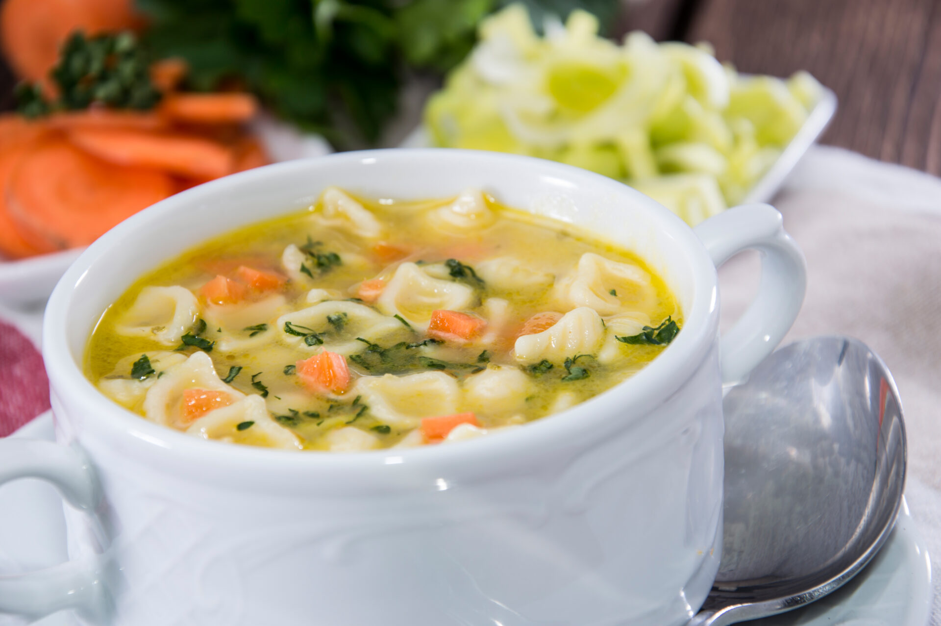 Bring Butcher’s Chicken Bone Broth to simmer and add onions and carrots, cubed chicken, and pasta.