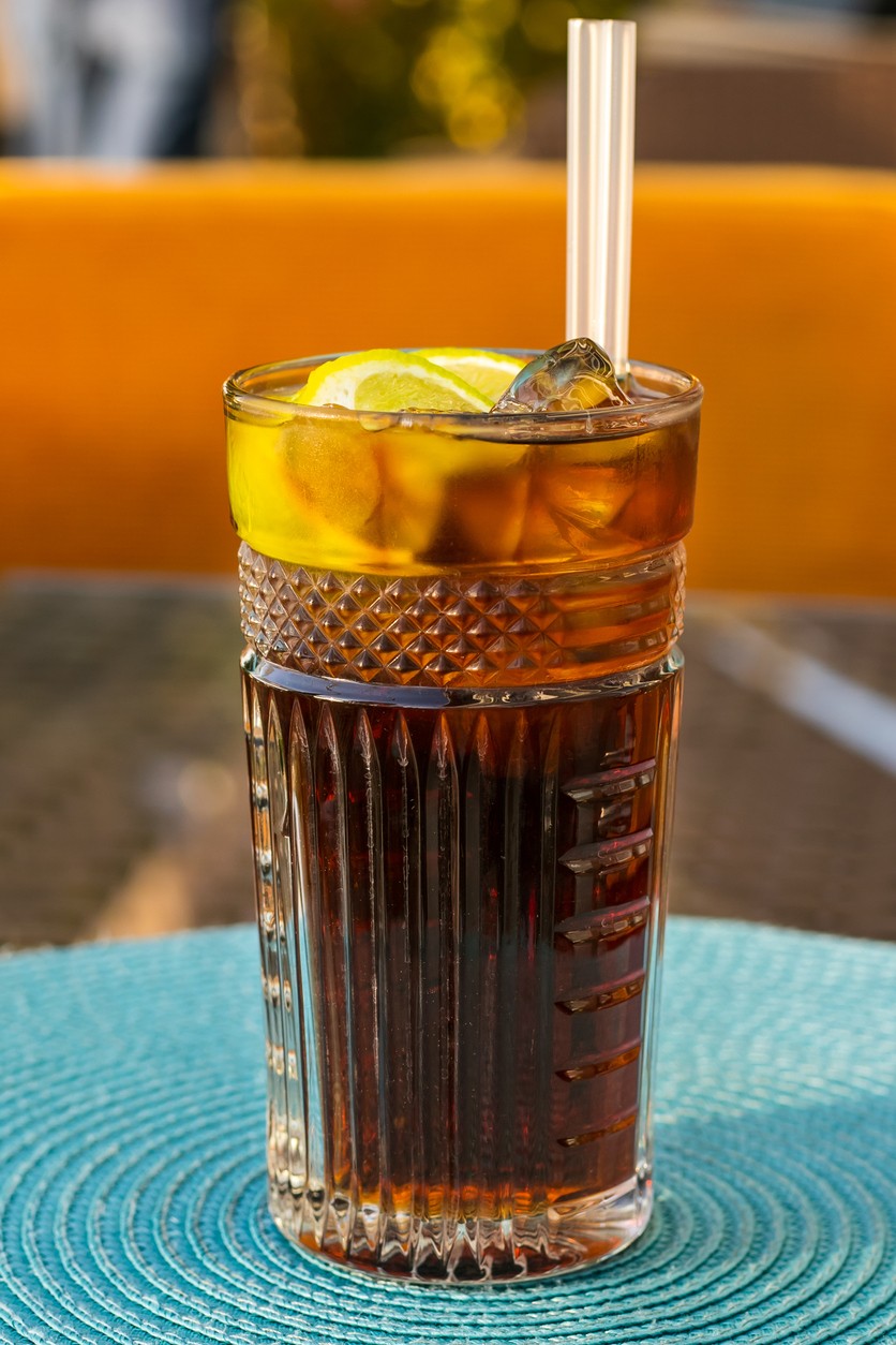 Strain into a Collins glass over ice. Top with Cola, then stir gently to combine. Garnish with a fresh lemon wedge before serving.