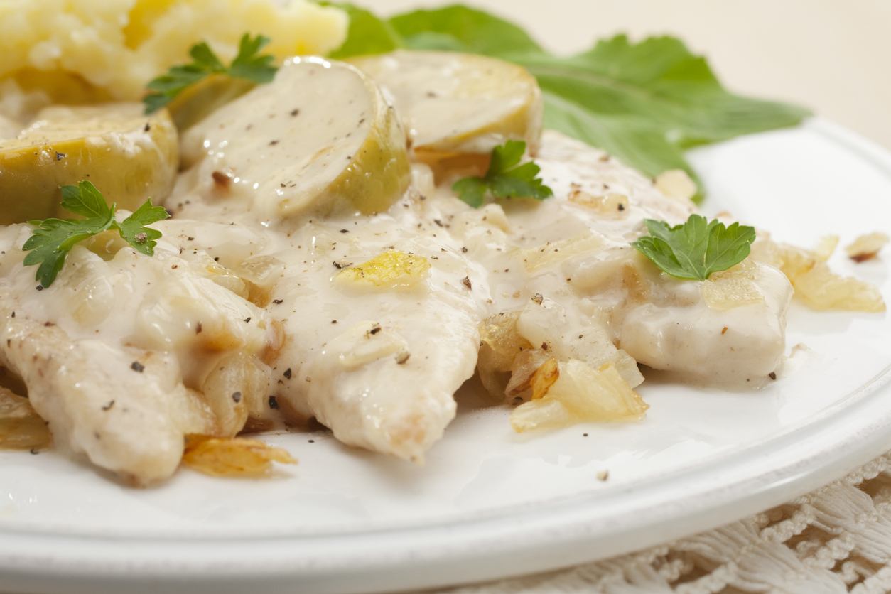 To finish, transfer chicken, apples, and onions to a dish and keep warm. Add 2 tablespoons of water to corn starch to make a slurry, then stir slurry into braising liquid; raise heat to medium and simmer until thickened (about 1 to 2 minutes). Stir in crème fraiche, and season to taste with salt and pepper. Return chicken, apples, and onions to sauce before serving.