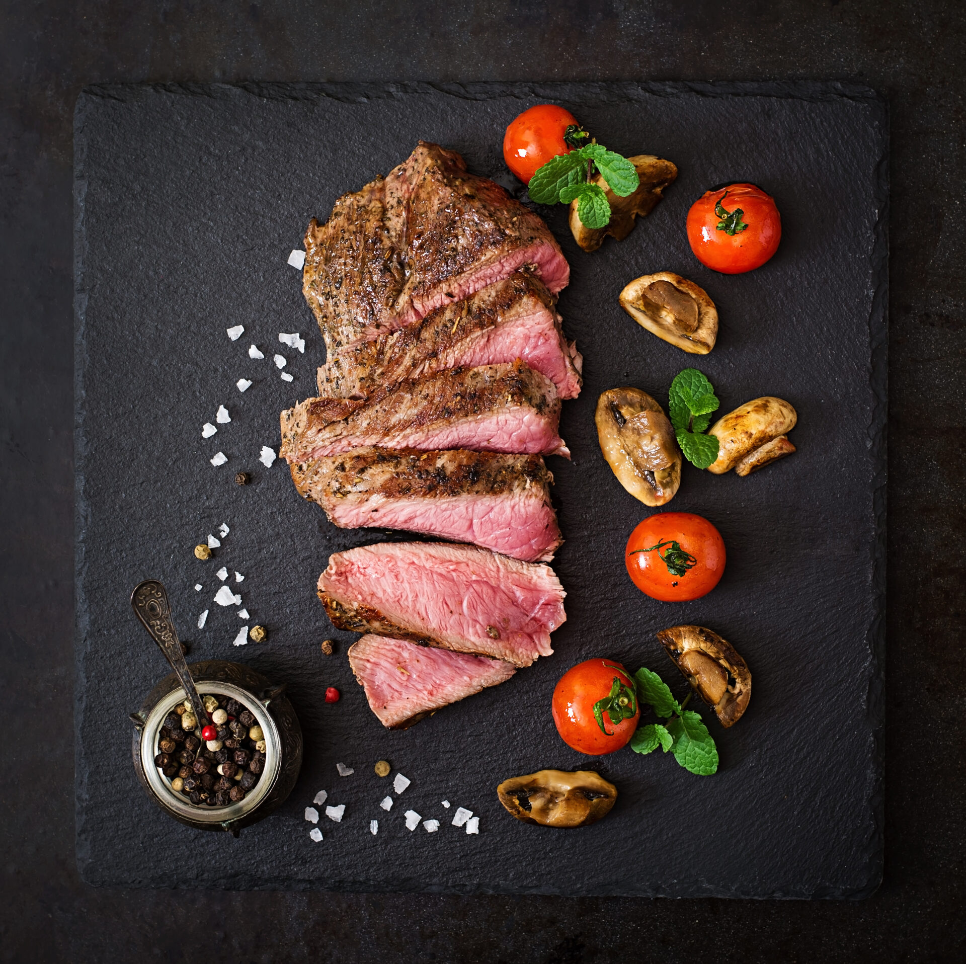 To serve, slice rested steak against the grain and top with mushrooms and pan sauce.