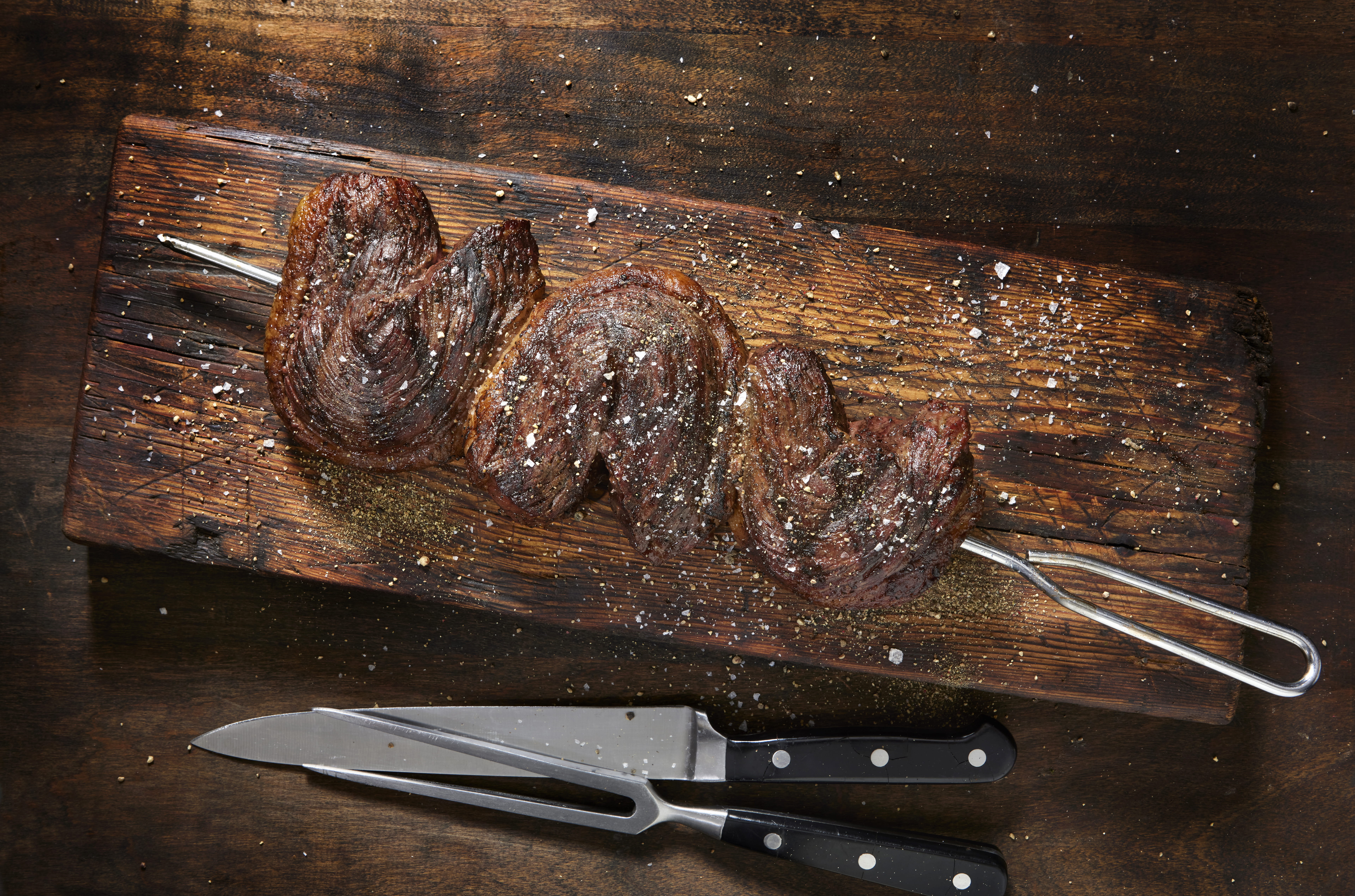 Once the steak is sliced, season with the salt and then the Brazilian steak seasoning (if using).
